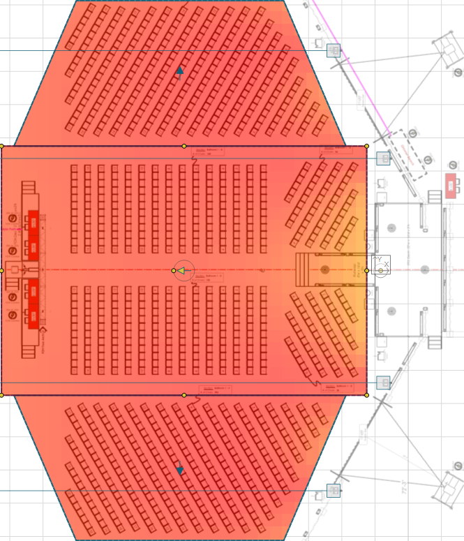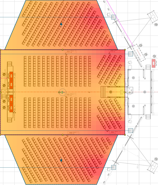 Company B has spec’d 6 boxes of a middle of the road compact line array as 3/Side on tripod stands, but these stands could also go up to 10’ tall…. (This might look like HDL6a, HDL26A, T4) This allows them to design a 1Far/2Mid/3Close approach to the speakers and get them above the heads of the attendees. Now the design you requested from them looks VERY even and covers 100% of your audience. No complaints, nobody getting BLASTED in the front row so the back row can hear. Perfect!